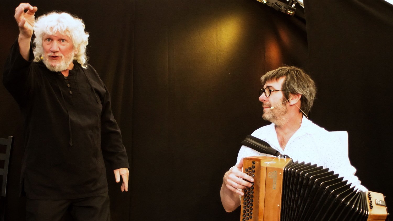 A la faveur du crépuscule naissant, Jean-Marc Derouen et Yann-Loïc Joly installent leur histoire de cétacé en forêt. Un conte d’amour, d’aventures incroyables à travers l’eau salée et la terre bretonne vous attendent en lisière. Soyez prêts à partir en accordéon, hors du temps et au-delà du réel.